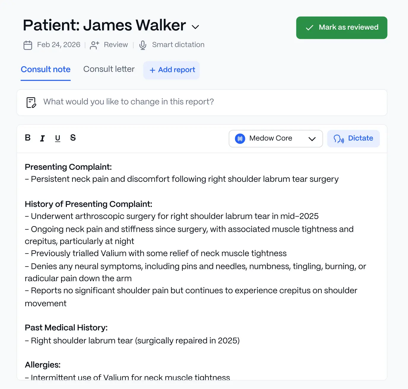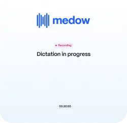 Dragon Medical is speech-to-text software: it transcribes your words literally, including requiring you to dictate punctuation commands. Medow is an AI documentation platform: it understands sentences, adds formatting automatically, applies specialist clinical reasoning to structure the output, and syncs the completed letter directly into your PMS. The workflow feels similar to dictation — the output is fundamentally different.